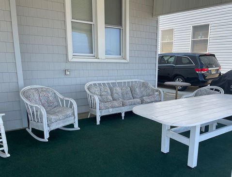 Large covered front porch with picnic tables to seat 16+ people. Separate seating area for relaxing as well as a gas grill for barbecues.